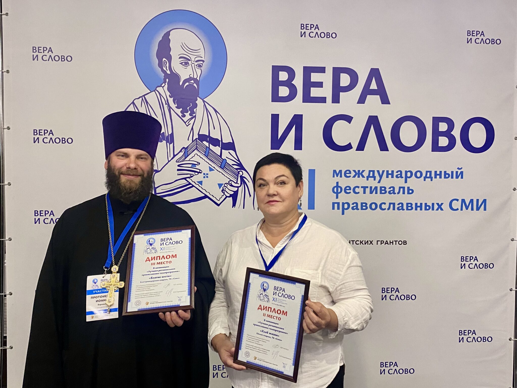 Дипломы и памятные подарки вручили председатель Синодального отдела по взаимоотношениям Церкви с обществом и средствами массовой информации Владимир Романович Легойда и генеральный директор, генеральный продюсер Первого общественного православного телеканала «СПАС» Борис Вячеславович Корчевников.