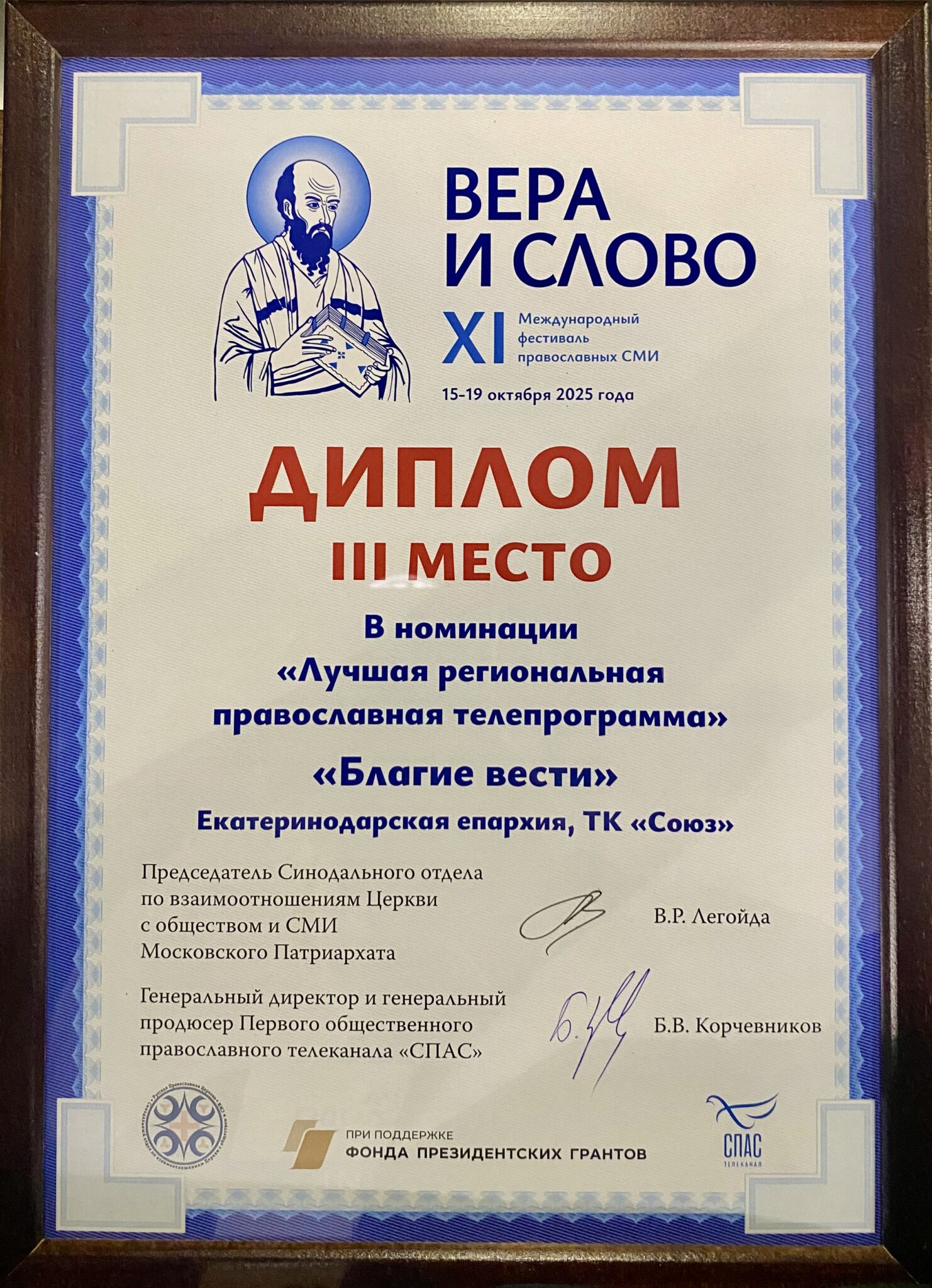 III место в номинации «Лучшая православная религиозная телепрограмма» номинации занял проект Екатеринодарской епархии «Благие вести».