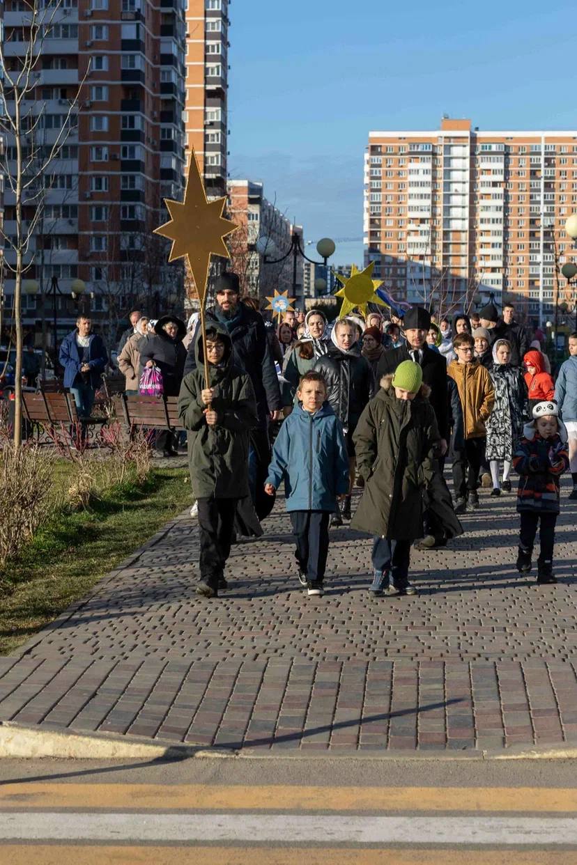 По завершении Божественной литургии духовенство, хор, прихожане и воспитанники Воскресной школы с родителями из храма направились по улице микрорайона возвещать всем жителям о радости Боговоплощения.
